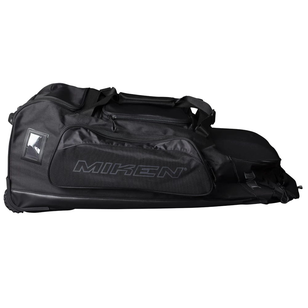 The all new Miken Championship Bag features a a padded 4 individual bat compartment, a telescoping handle, Wide set tank wheels with full bottom rails and extra base support for strength, balance, and durability, a vented shoe compartment, extra large main compartment and 2 smaller compartments, molded top converts to a shelf, removable decoration panel for customization, easy grip handles, clear ID window and durable “J” style hook.