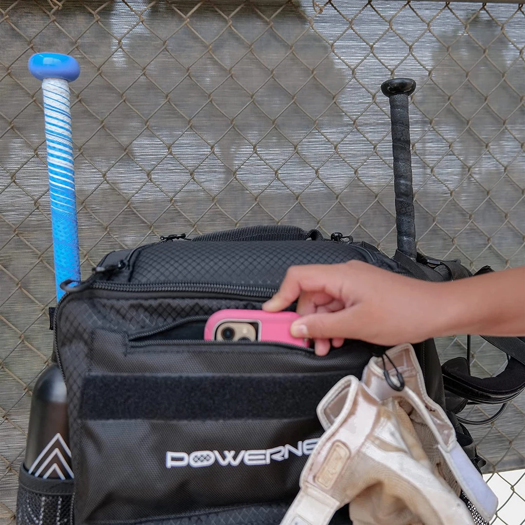 - ORGANIZED WITH MULTIPLE POCKETS;Felt lined pocket designed for sunglasses; Includes a zippered felt-lined valuables pocket to keep your cell phone free from scrates while transporting; 2 large internal shelves; 2 fabric strips to attach batting gloves; Ventilated cleat compartment to allow your cleats to air out while in the bag