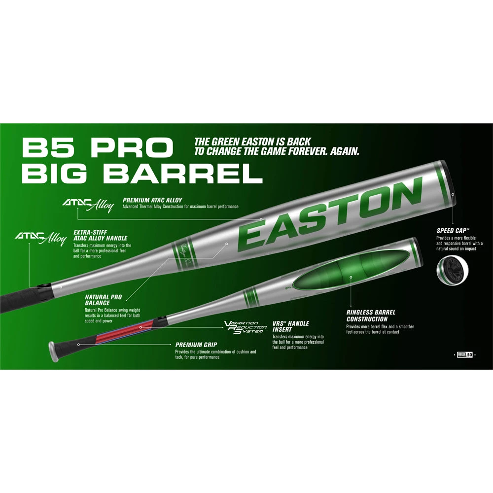 THE GREEN EASTON IS BACK! First introduced in 1978, the original B5 Pro Big Barrel bat boasted the largest barrel aluminum bat ever made to that point in time for a larger sweet spot. And after 40 years in the making, all of Easton’s innovations have produced a new breakthrough worthy of the B5 Pro Big Barrel name. The new B5 Pro features a ringless barrel with varying wall thicknesses. This premium Advanced Thermal Alloy Construction (ATAC) produces a bigger sweet spot and smoother feel for B5 Pro than any other bat of its kind. And, combining its construction with Easton’s Speed Cap™, the B5 Pro also provides a more flexible and responsive barrel. Additionally, the bat’s Natural Pro Balance Swing Weight results in a balanced feel for both speed and power. Its Extra-Stiff ATAC Alloy Handle transfers maximum energy into the ball for a more professional feel and performance, while its VRS™ Handle Insert reinforces the handle to reduce vibration and create an even more solid feel. The B5 Pro also has a premium grip, which provides the ultimate combination of cushion and tack. Not only is the 2021 B5 Pro the best performance, feel and sound that Easton has ever engineered in a 1-piece aluminum BBCOR bat, the bat’s design is a modern remix of The Green Easton’s classic look. THIS CHANGES EVERYTHING. AGAIN.