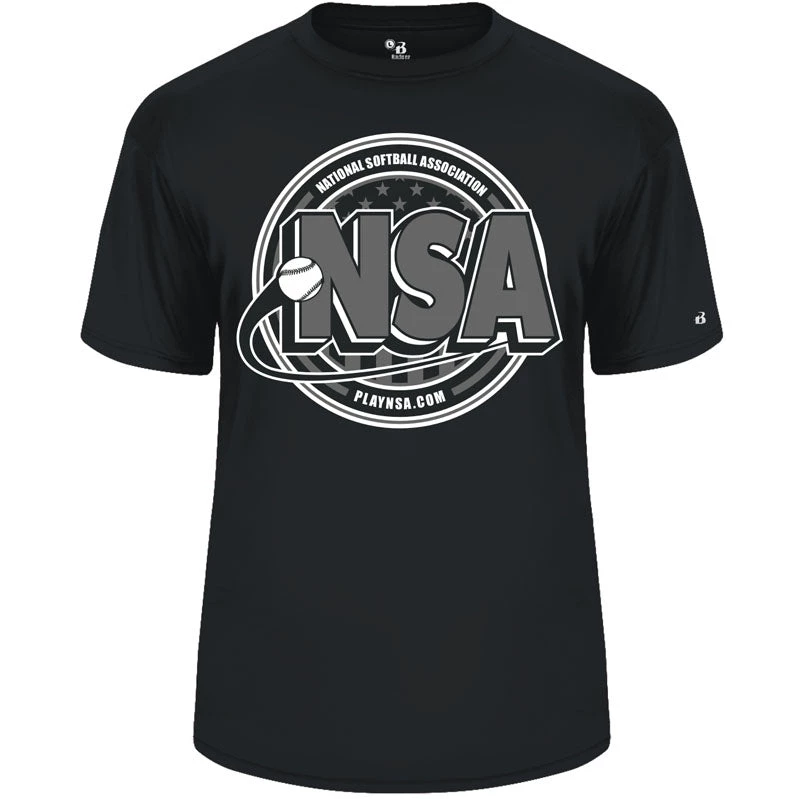 Represent the National Softball Association with this Badger Splitter Moisture Management Short Sleeve Shirt! The back features a sublimated pinstripe pattern made from the Ball Stitches!