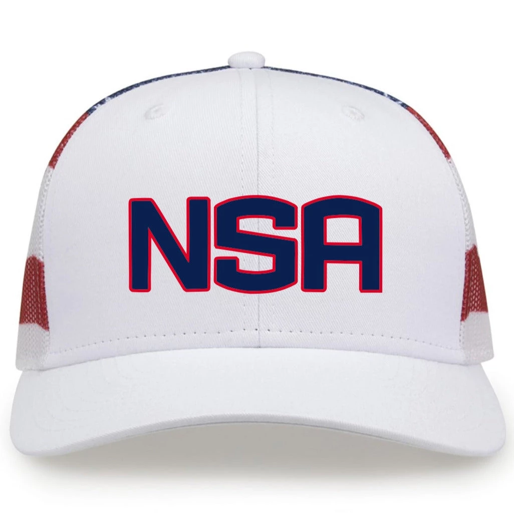 Represent the National Softball Association with this Patriotic White & American Flag Snapback with a flat NSA Logo.