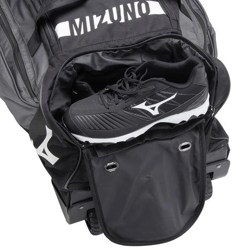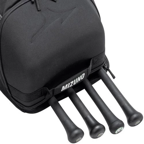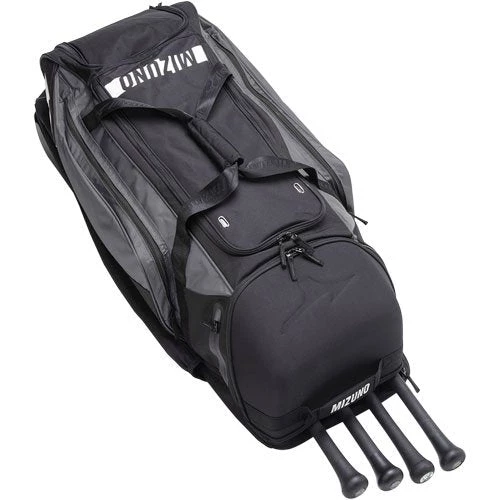Full of exceptional features to store and protect your gear, the new Samurai Catcher’s Wheel Bag X is a popular choice with the Mizuno Pros. This catcher’s equipment bag with wheels features a molded, fleece lined glove compartment provides superior protection for your mitt, while the main compartment is designed to comfortably fit all of your gear. There are multiple side storage compartments and a ventilated footwear storage compartment with a zip off panel for embroidery. Additionally, there is an insulated drink pouch, waterproof zip valuables pocket, utility hooks for helmet/glove/etc in top glove compartment, a quick-access side bat pocket and bat zip pocket for 4 bats. Dual J hooks allows for convenient fence hanging, while off-road wheels and running boards give premium stability and toughness that catcher’s need.