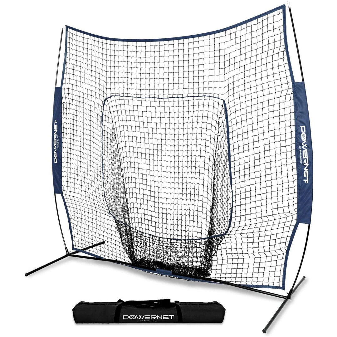 - 7’x7′ PRACTICE NET – Instant portable baseball & softball net. Large sock net area can hold multiple buckets of balls, no need to stop the training session. Large bow style frame holds net secure and gives 49 SqFt. of hitting surface or protection. Includes 7ft x 7ft net, ground stakes and 1 heavy duty zipper carry bag with shoulder strap.