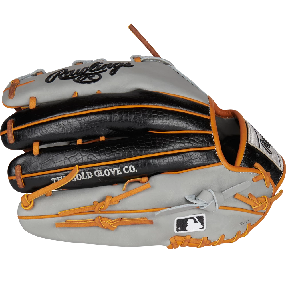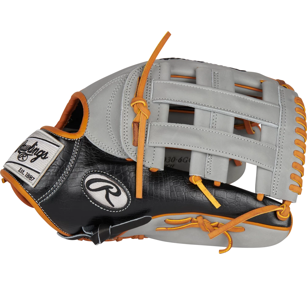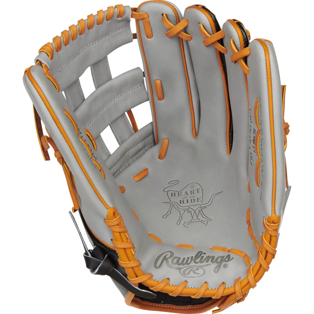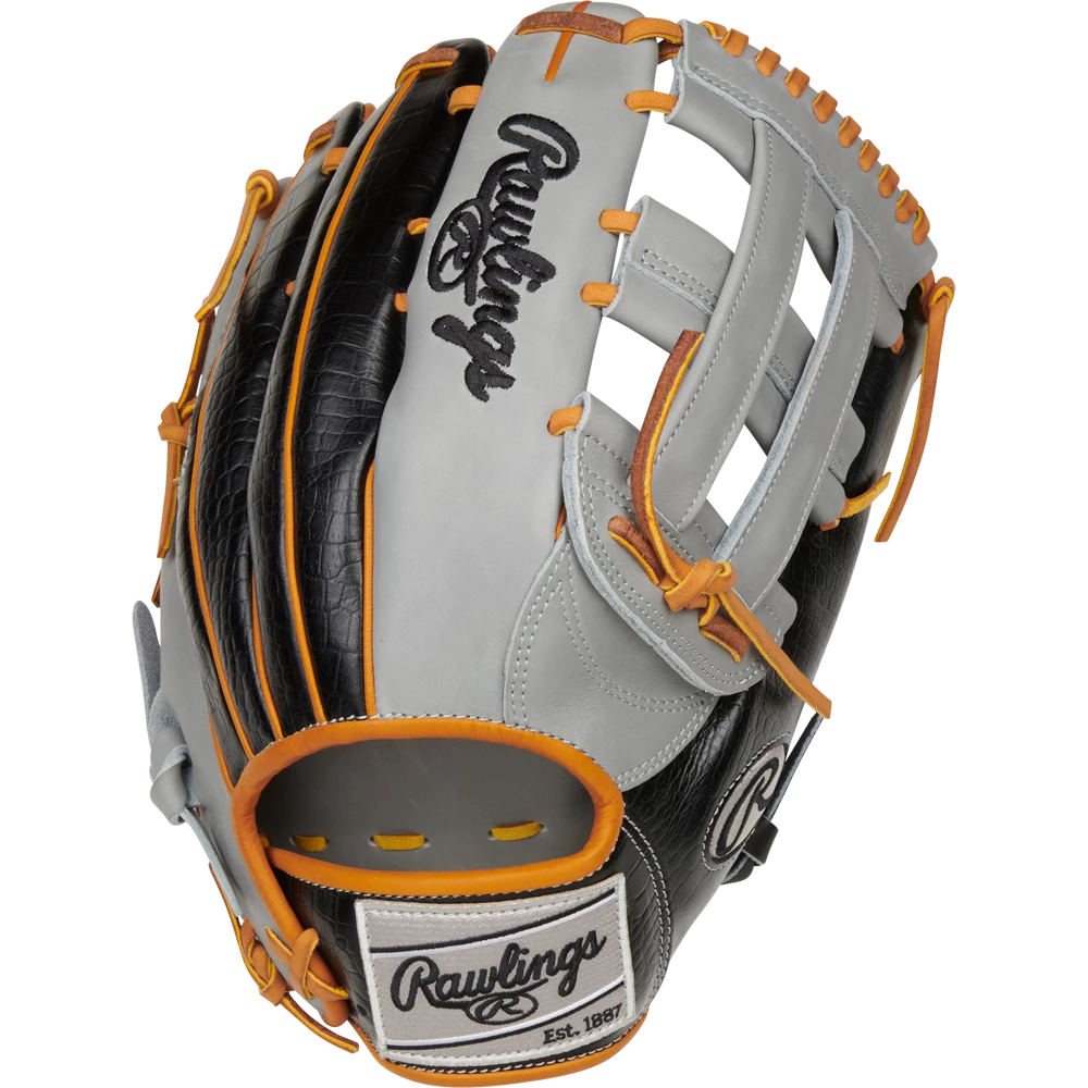 Make every play a work of art with the Heart of the Hide ColorSync 5.0 13-inch outfield glove. It was meticulously crafted from our ultra-premium steer-hide leather, and includes a stylish croc-embossed design. The black, croc back is perfectly accented by the gray & orange binding, welting, and lacing; and the unique gray patch make it a great addition to the ColorSync 5.0 line.