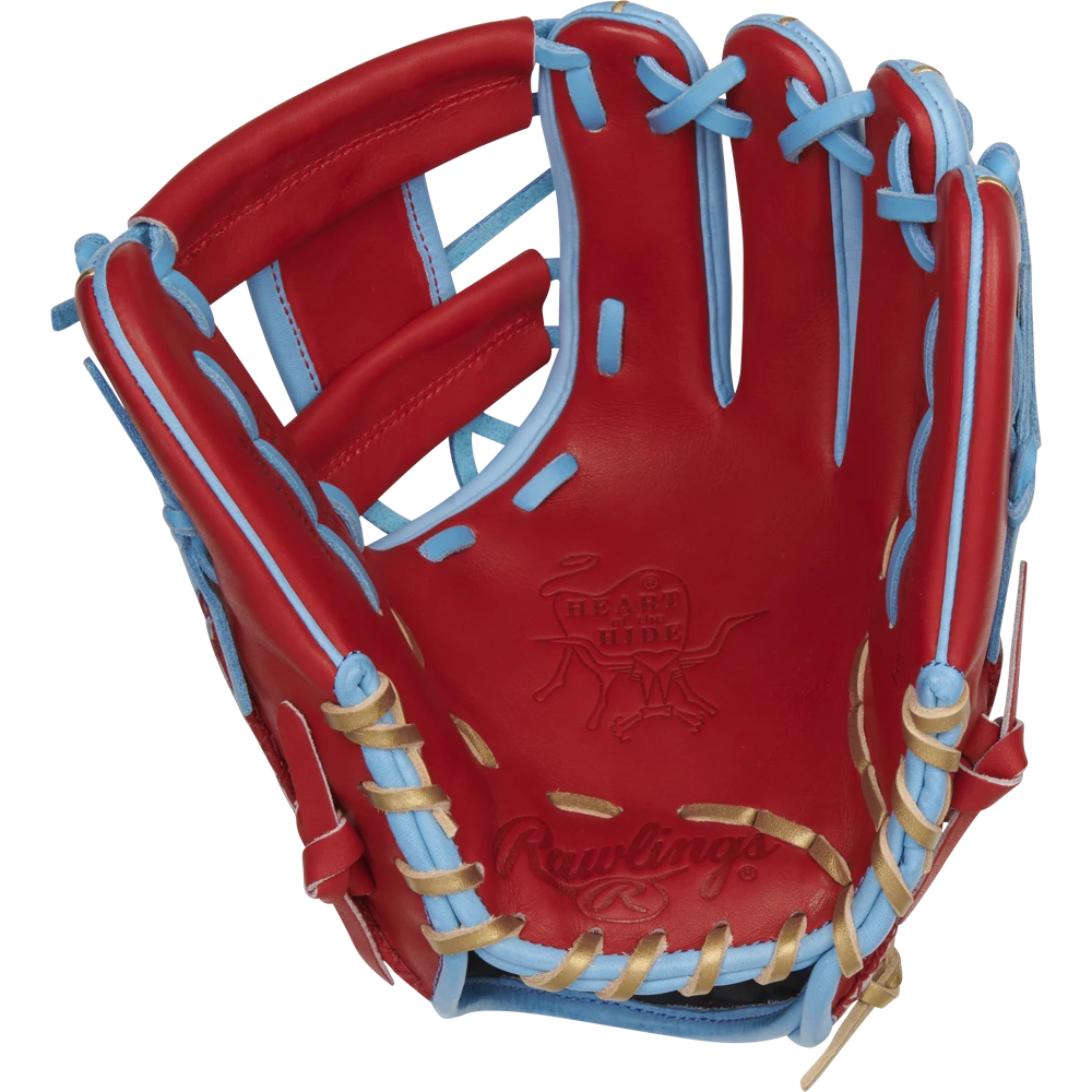 Add some color to your game with the 11.5-inch Heart of the Hide ColorSync 6.0 infield glove! Our glove designers crafted this gamer from our ultra-premium steer-hide leather, giving you superior quality and performance every inning out. On top of that, this glove turns heads with its design. The stylish Columbia blue & scarlet colorway comes with a unique two-tone scarlet and gold I-web. It even has an ultra-rare red and gold Rawlings ColorSync patch to distinguish itself. In addition, the interior features a deer-tanned cowhide lining, thermoformed wrist lining, and a padded thumb sleeve for the unmatched comfort you expect from any Heart of the Hide glove. This infield glove even features hand-sewn welting for an extra personal touch. To pull it all together, this features our popular 200-pattern, a top choice of MLB infielders for its large, deep pocket. As a result, you’ll make tricky short-hops and hard liners look routine — and you’ll look great doing it! When you try on this limited edition 11.5-Inch HOH ColorSync 6.0 infield glove, you’ll know right away you found your next gamer. Order yours now before it’s gone!