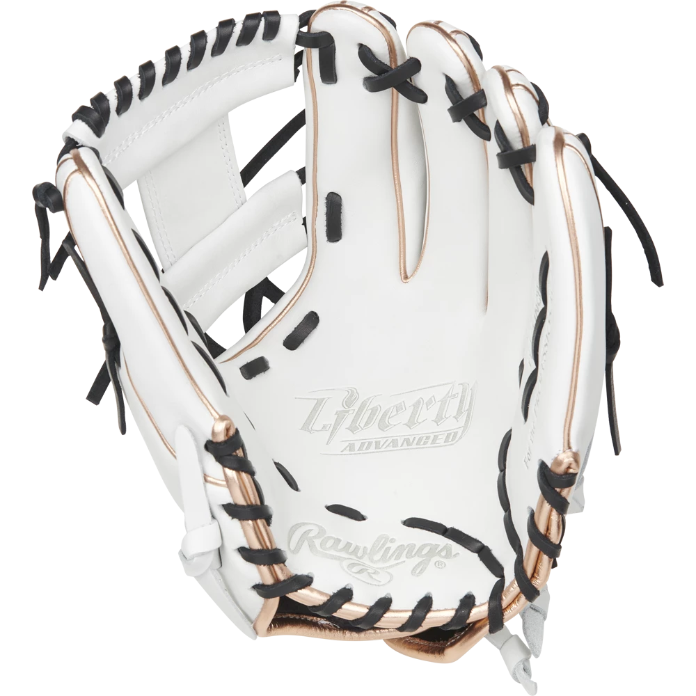 This Liberty Advanced infield glove is constructed in our popular 71-pattern, designed specifically for fastpitch infielders. The large pocket and better fit for softball players’ hands allows you to maintain full control under any playing conditions. In addition, its adjustable Pull Strap gives you a custom fit to increase your glove control even more. The rose gold accents also add the perfect touch of style to the popular white and black design.